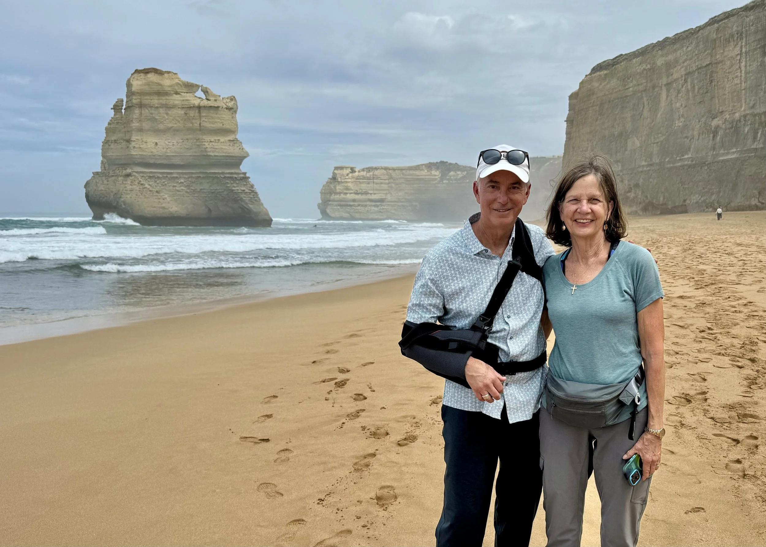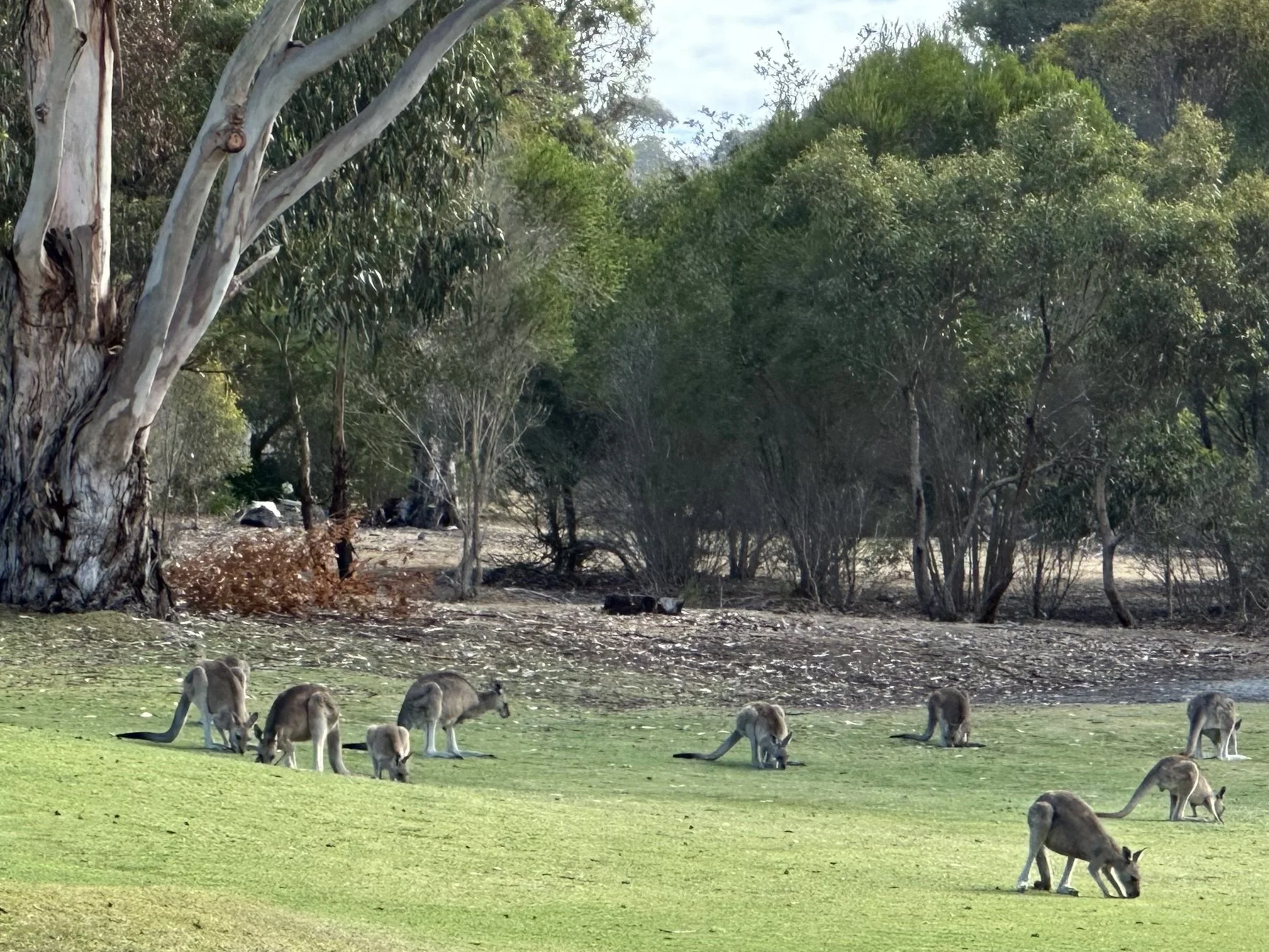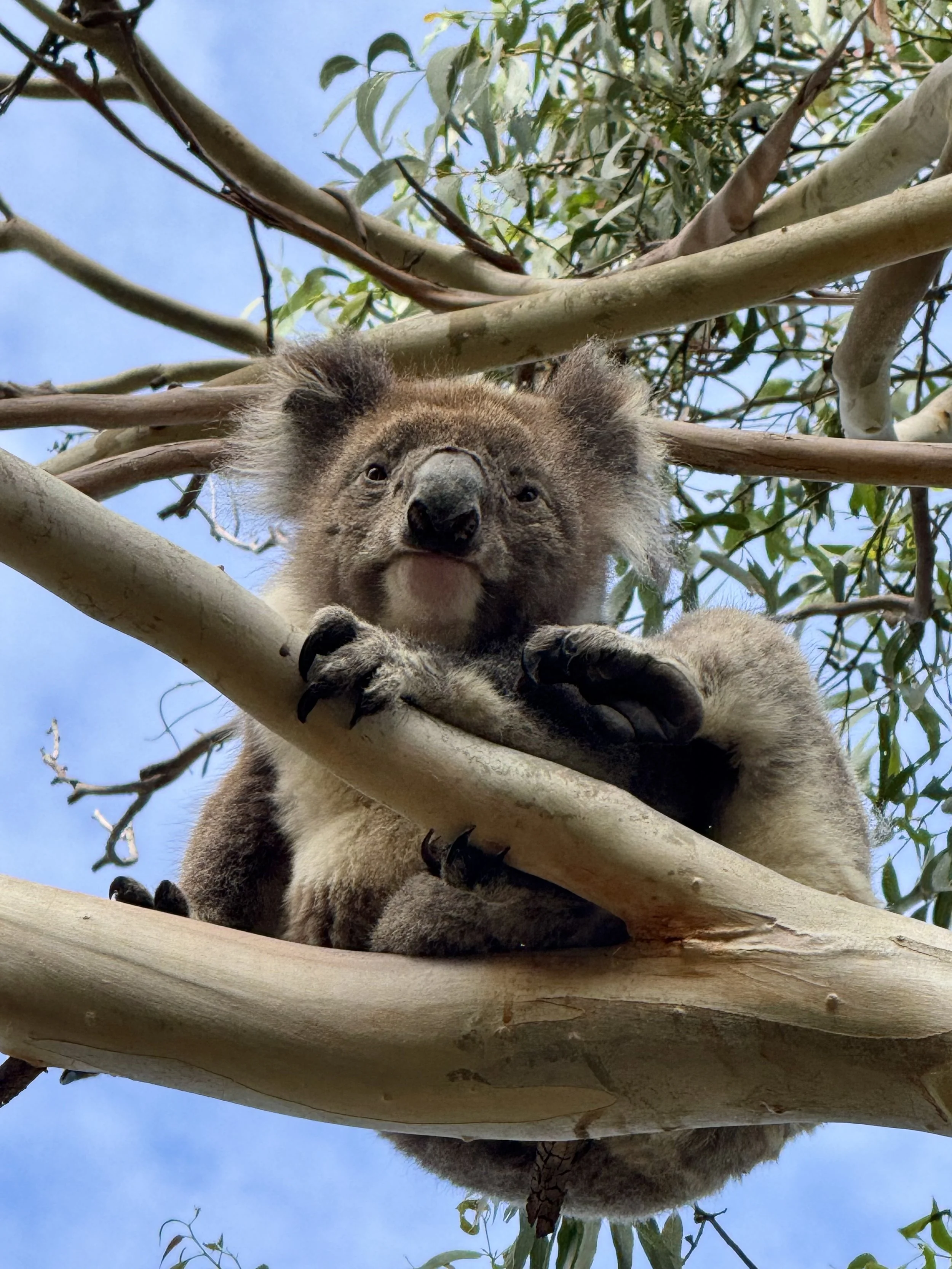 A highlight of our visit was our tour/drive of the Great Ocean Road. It is one of the most scenic and dramatic coastal drives we’ve experienced! We had incredible views of the 12 Apostles from the cliffs, beach and in a helicopter! We walked through rain forests, viewed waterfalls, and got up close to wild koala bears. During our drive, we saw so many birds and other wild Australian wildlife and ended the drive with watching many kangaroos hanging out on a golf course!